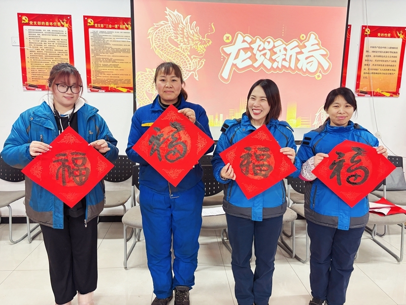 “千門萬戶曈曈日,總把新桃換舊符”。龍年春節將至,為豐富職工的文化生活,弘揚中華民族的傳統文化,1月31日,公司2024年迎新春“送萬福、進萬家”書寫春聯服務職工活動在工業園鉚焊車間會議室舉行。特邀書法家們飽蘸濃墨、提筆揮毫為大家送來新年祝福。公司黨委副書記、工會主席胡立群來到現場參與活動。 本次活動的開展得到了職工們的熱情響應,從活動開始到結束,前來參與的職工絡繹不絕。“龍騰盛世千家樂 春滿神州萬物昌”“春風萬里榮新紀 紅日千秋耀錦程”一句句飽含著大家對美好生活向往的祝福話語躍然紙上,一幅幅帶著墨香...